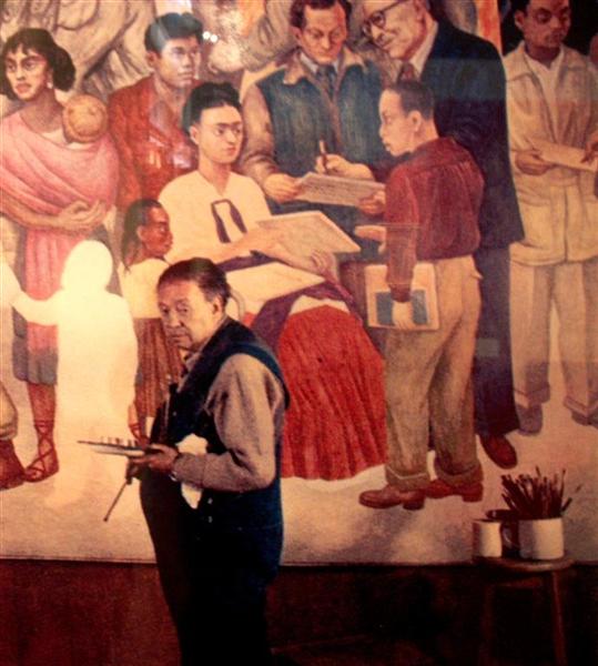 Close-up on center figures the "Dream on..." mural: Diego Rivera (as a child), with his future wife, Frida Kahlo, standing behind him.